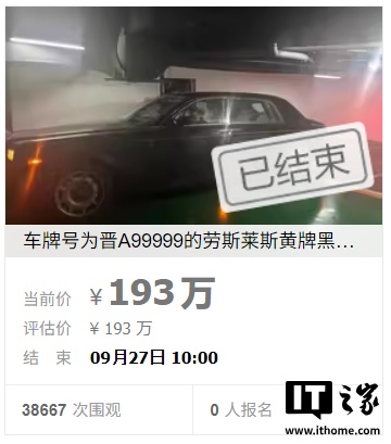 IT之家 10 月 13 日消息,阿里拍卖平台显示,一辆车牌号为晋 A99999 的劳斯莱斯黄牌黑色轿车将于 10 月 17 日被司法拍卖,起拍价 154.4 万元,评估价 193 万元。